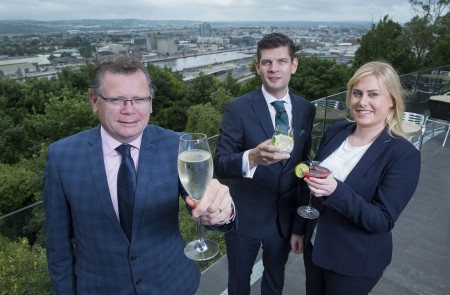Frankie Whelehan with Donald Morrissy and Daniel O’Rourke members of hotel staff of the Montenotte Hotel pictured celebrating the completion of works which has transformed Cork’s third largest hotel into a superior 4 star, luxury destination following a multi million euro investment. Picture by Gerard McCarthy.