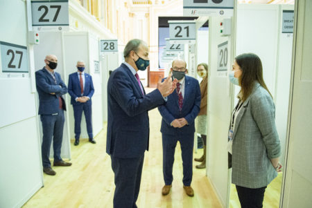 An Taoiseach Micheál Martin today visited the vaccination centre at City Hall and viewed the ongoing preparations to prepare a vaccination centre, including the installation of 30 vaccination booths and a post-vaccination observation area. When fully operational, there will be 30 vaccination booths at City Hall, with the capability to operate seven days a week, delivering up to 2,400 vaccinations a day.