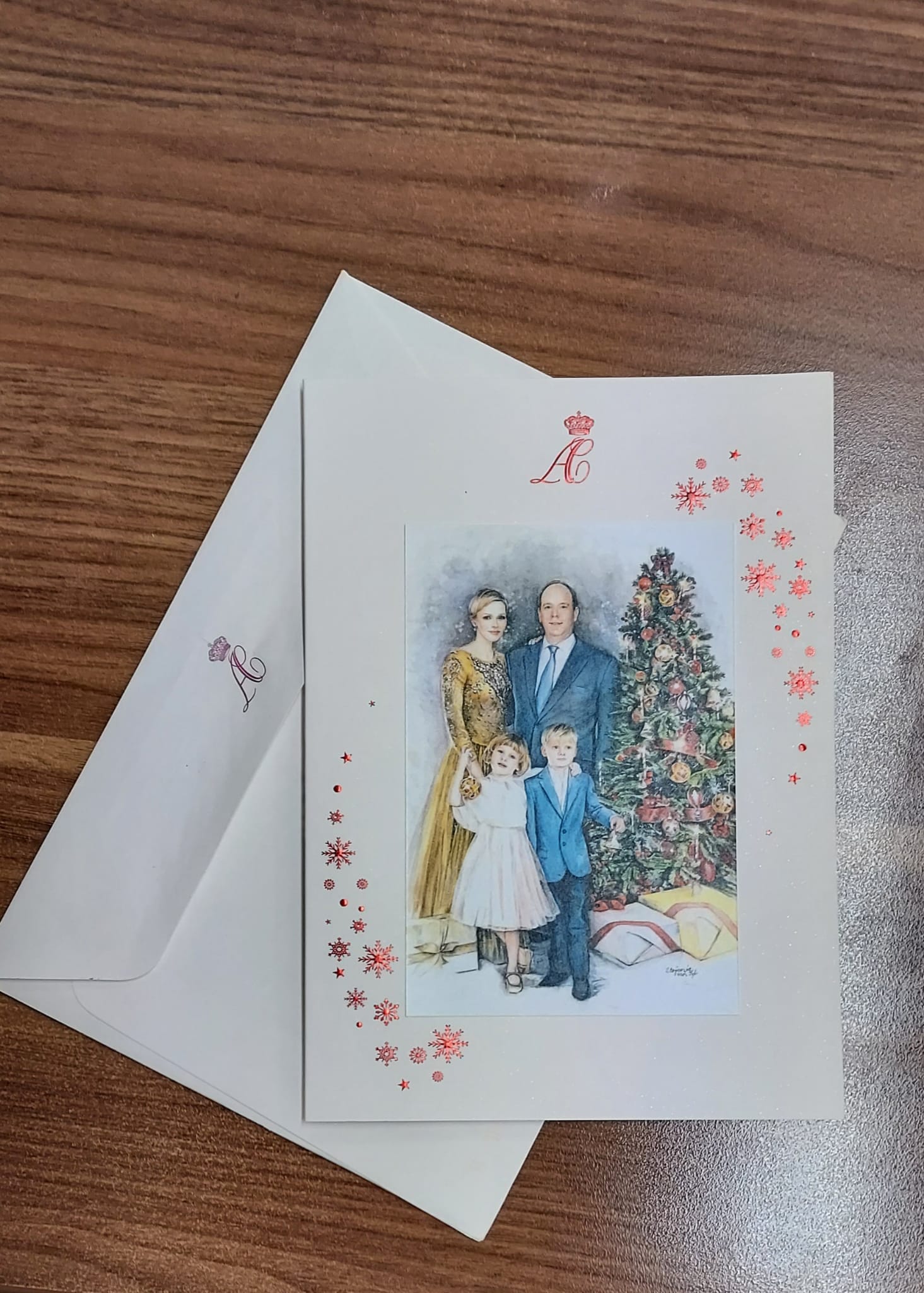At first glance the elegantly penned address on the crisp white envelope may have hinted that this was no ordinary greeting card, but the real clue as to its royal origins along the French Riviera were further suggested by the distinctive post mark ‘Bonne Année Monte Carlo, Pte De Monaco’ along with a crown motif. Upon opening the envelope an greeting card featuring an illustrated family portrait of the Royal Family of Monaco was revealed. The colourful illustration features Sovereign Prince Albert of the House of Grimaldi along with his wife Princess Charlene of Monaco and twins Princess Gabriella and Prince Jacque standing by a decorated Christmas tree. The thoughtful greeting inside as follows “At the dawn of this New Year we send our warmest wishes for a Merry Christmas and Happy New Year 2022” and was signed by Prince Albert and Princess Charlene with French and Monegasque.