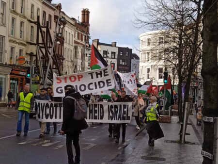 The demonstrators included contingents marching behind banners representing various professions and social groups, including Teachers for Palestine, Parents Against Genocide, Irish Association of Social Workers and Health Care Workers for Gaza.