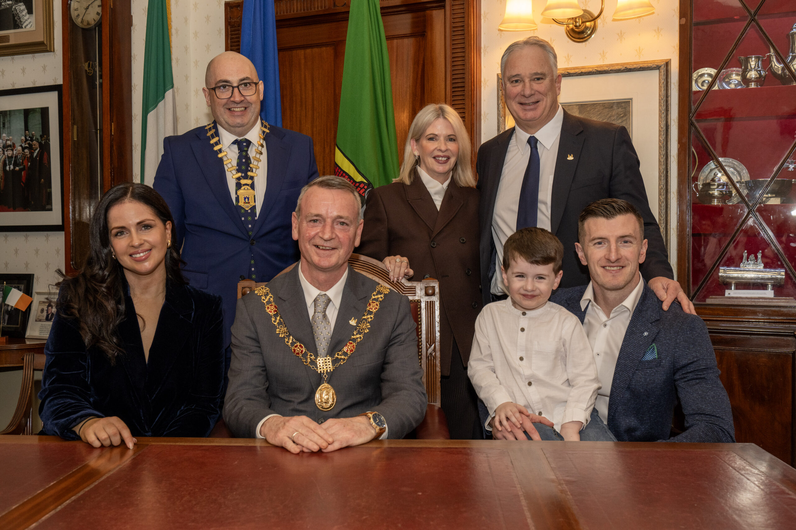 Pictured with the Lord Mayor of Cork, Cllr. Fergal Dennehy were Patrick Horgan, his wife Ashley and son Jack in the Lord Mayor’s Chambers. Also included are Rob Horgan, President, Cork Chamber of Commerce; Valerie O’Sullivan, Chief Executive, Cork City Council and Cork hurling legend Tomás Mulcahy.