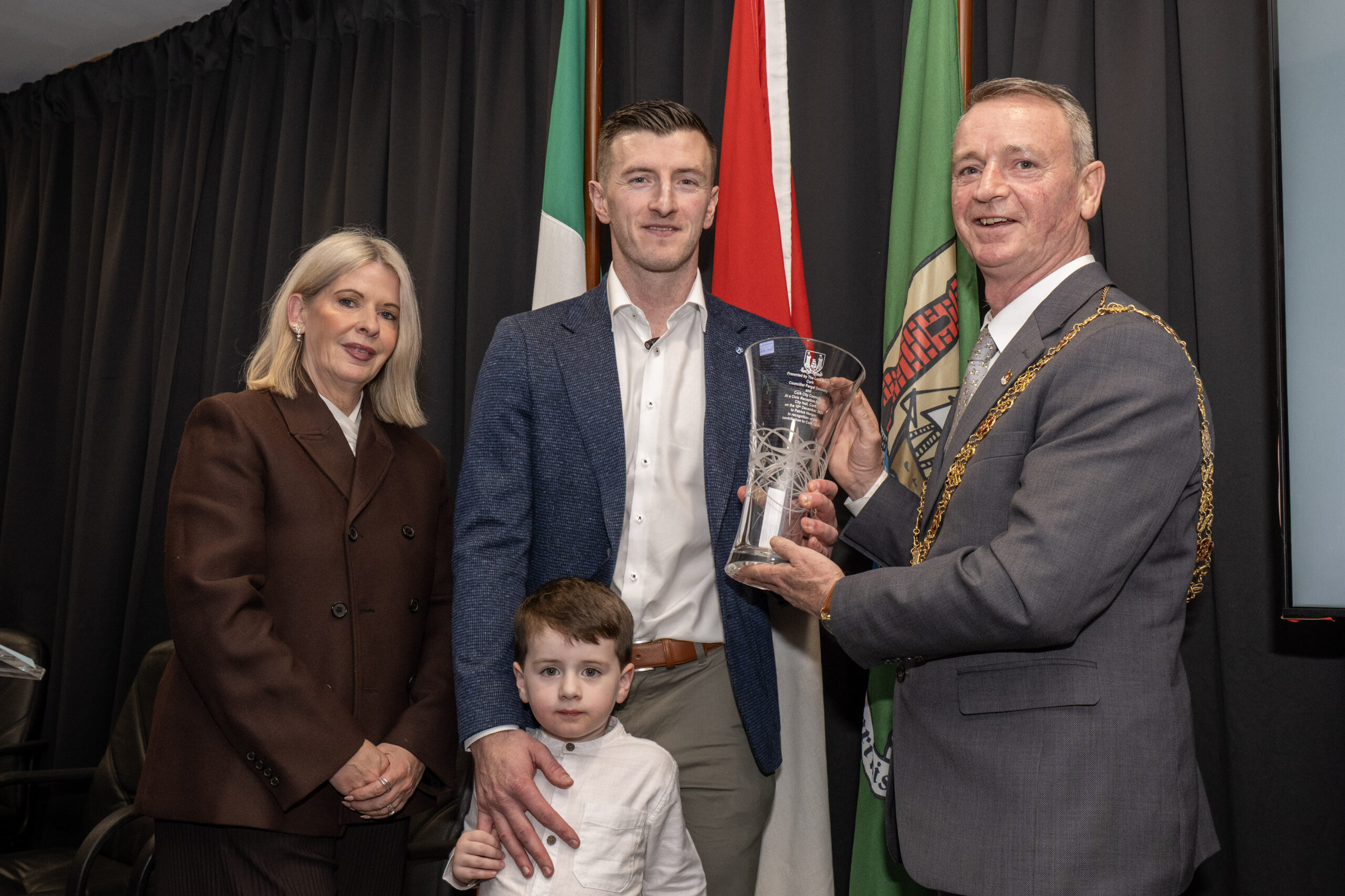 Cork’s Lord Mayor, Cllr. Fergal Dennehy make a presention on behalf of Cork City Council to Patrick Horgan. Also included is Patrick’s son Jack , his wife Ashley and Cork City Council Chief Executive Valerie O’Sullivan.
