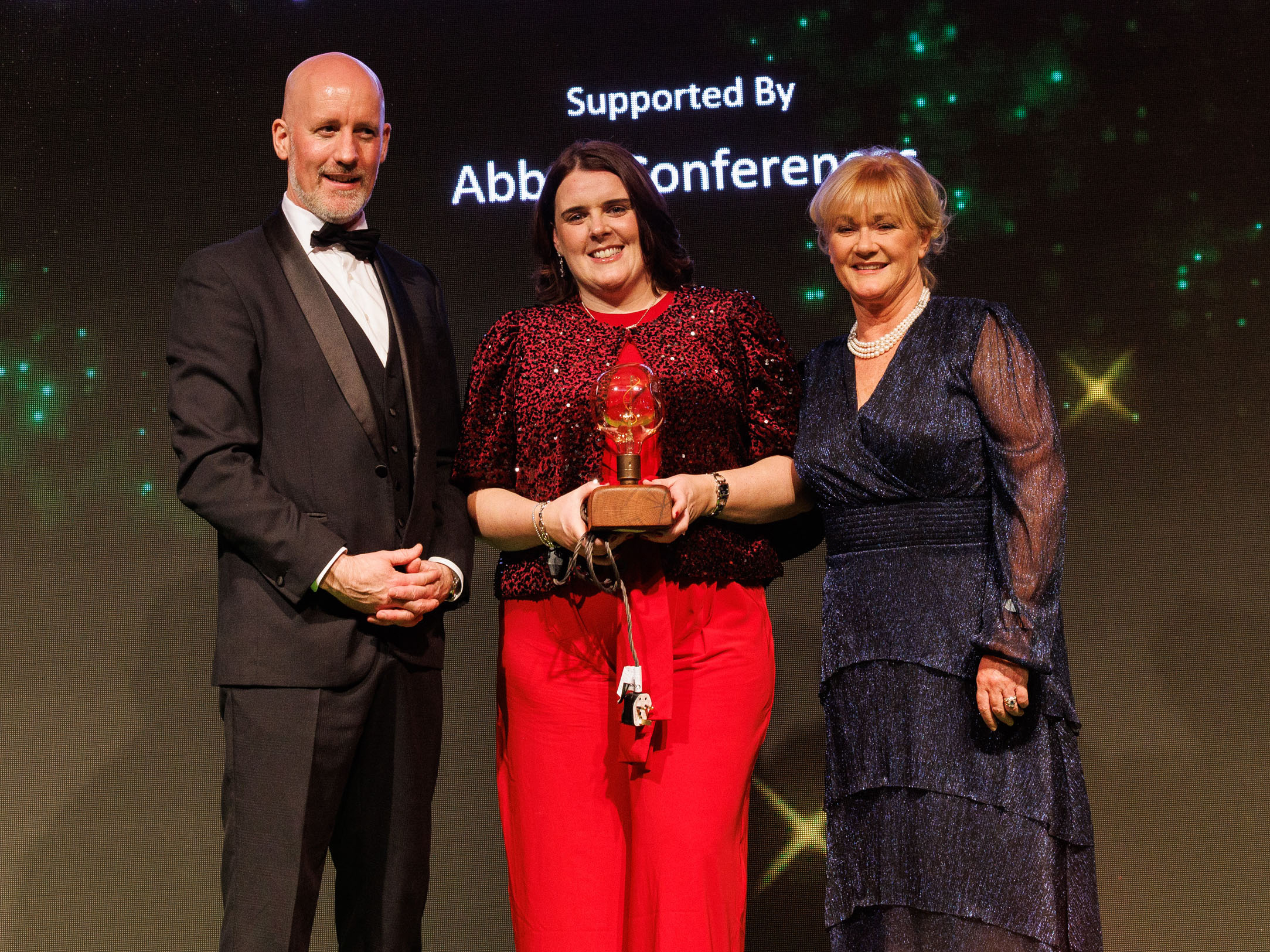 Dr. Lyndsey El Amoud, of University College Cork, has been named winner of the Social Impact and Legacy Award for embedding meaningful social impact into every stage of event planning of the 54th European University Continuing Education Network (EUCEN) Conference 2024, and is pictured receiving her award at Fáilte Ireland’s Conference Ambassador Recognition Awards from Paul Mockler and Ruth Andrews, Chairperson, Fáilte Ireland, at an award ceremony in the Royal Dublin Society