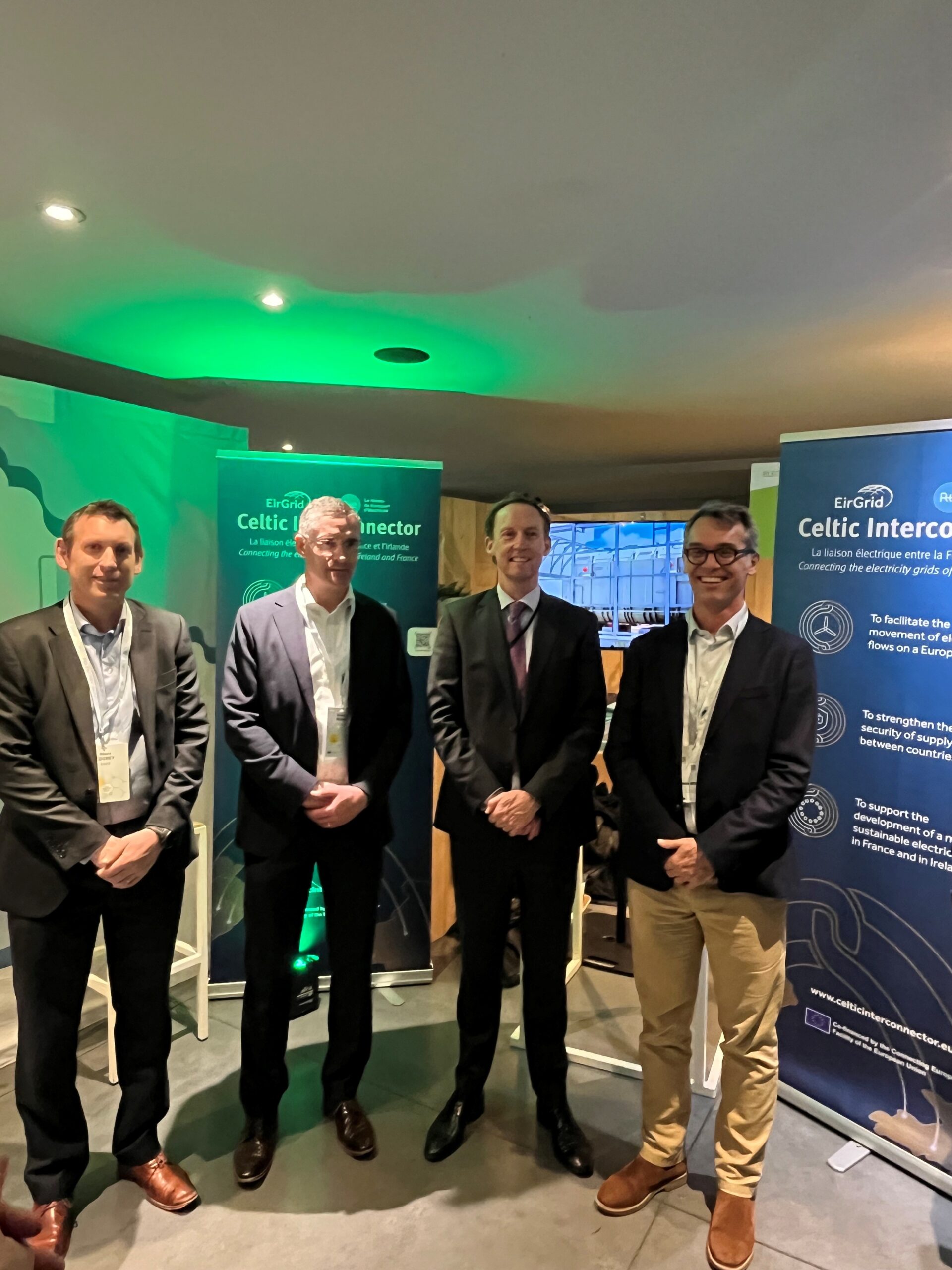 L-R Shane Cooney, EirGrid, Michael Behan, Chief Financial Officer, EirGrid, Barry Andrews, MEP and Rémi Courtial, Réseau de Transport d’Électricité (Rte) marking the two-year milestone in Brussels recently.