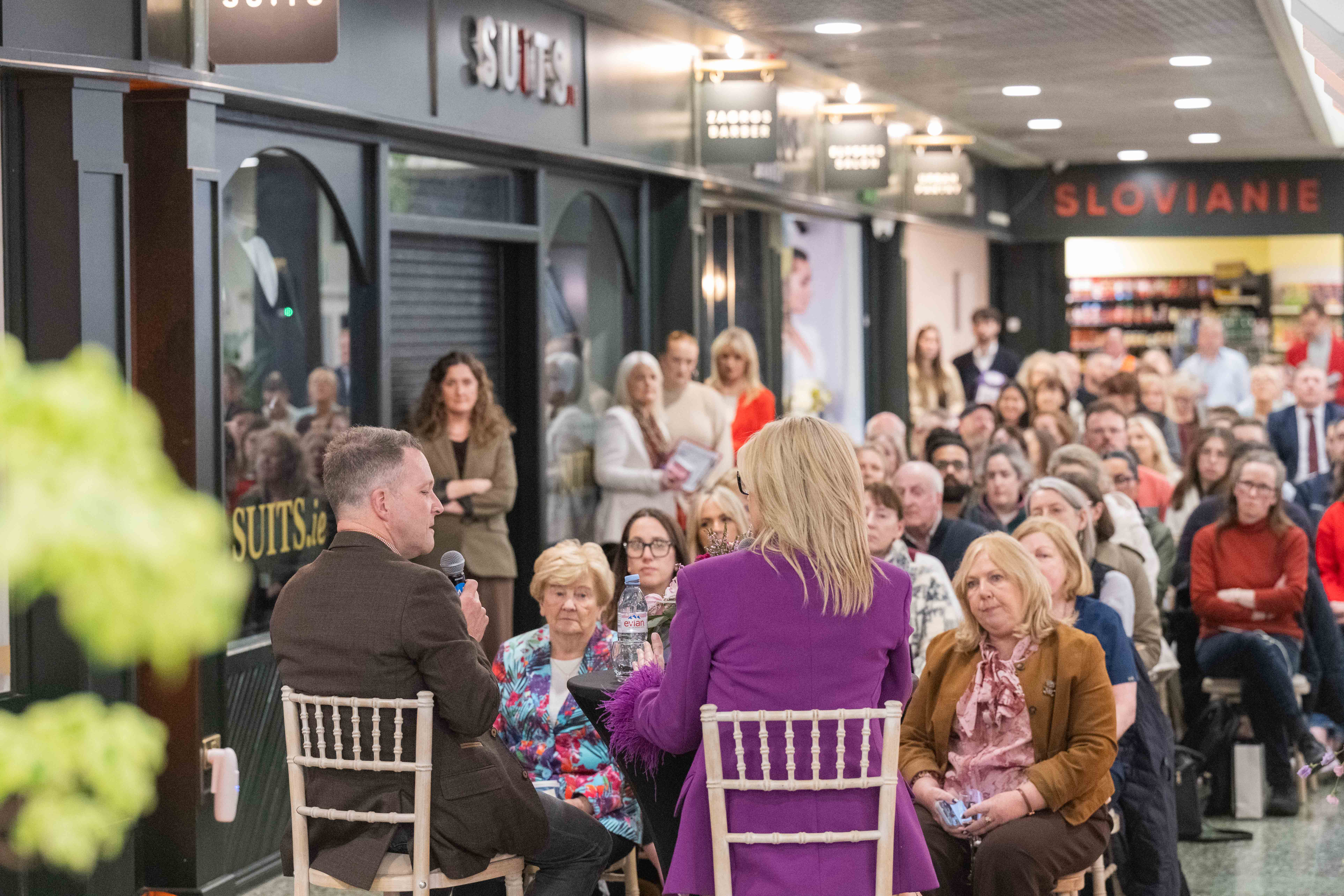 Guests at the launch of Celene Collins Interior Design’s new studio at The Fifth Quarter (Paul Street), Cork City, including Celene Collins and Kieran McCarthy engaging with attendees during a Q&A session. For more see celenecollins.com